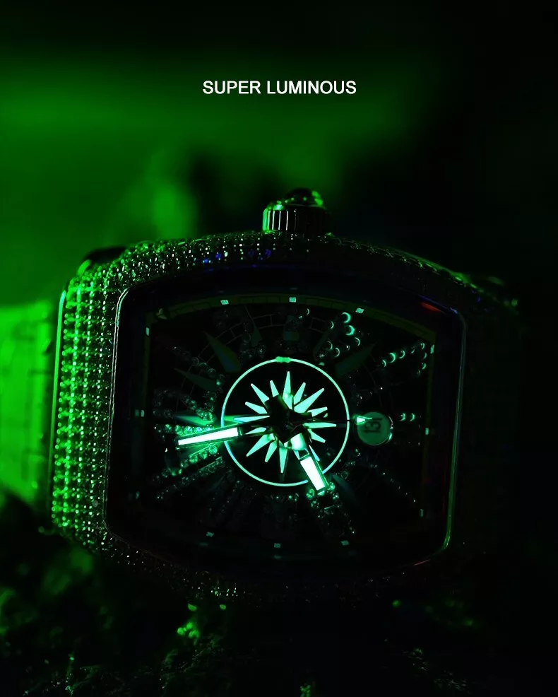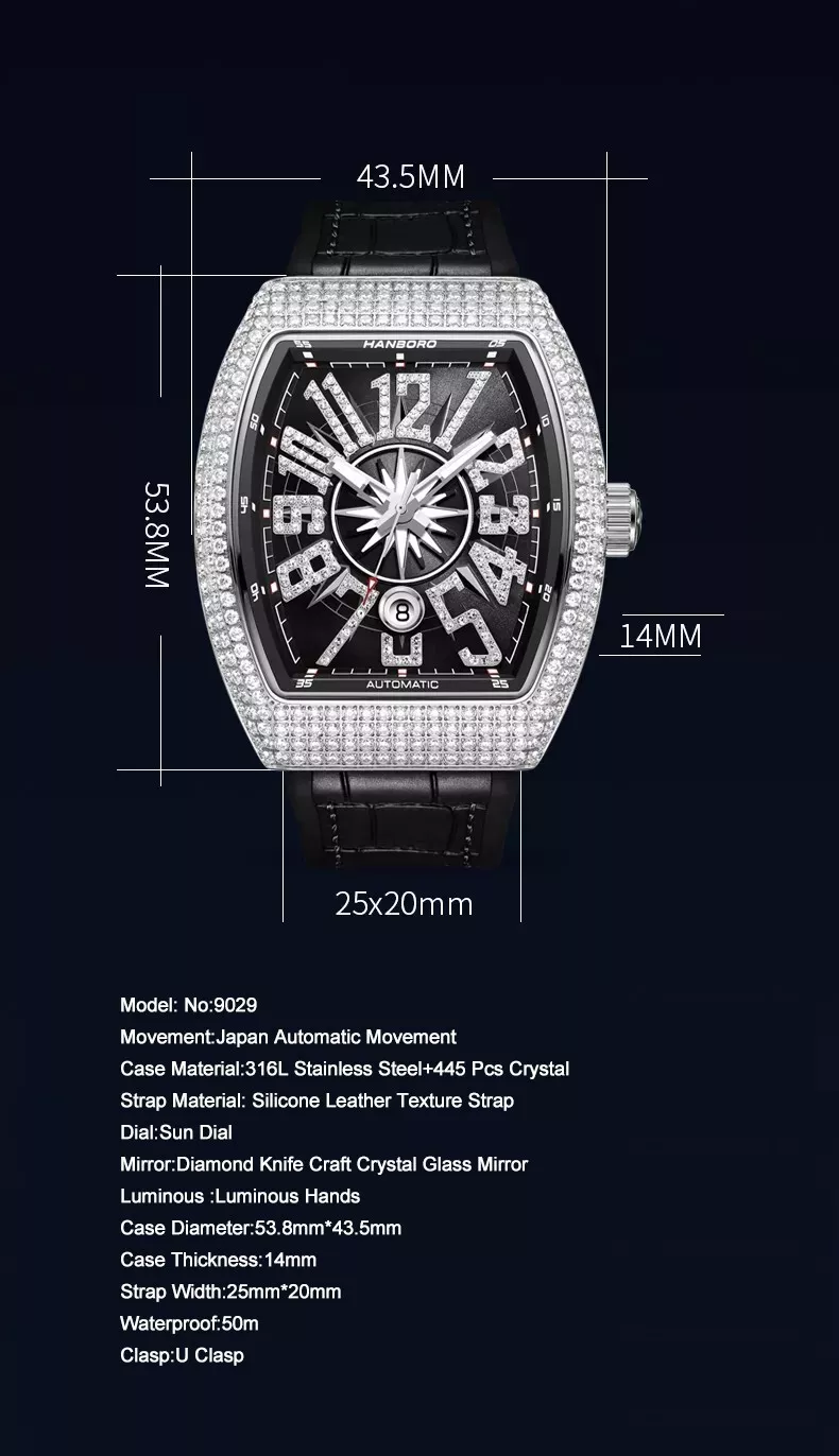 HB Men Automatic Watch Mechanical Wristwatch Tonneau Crystal Case Luminous