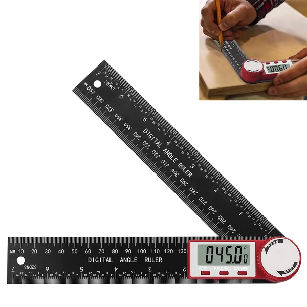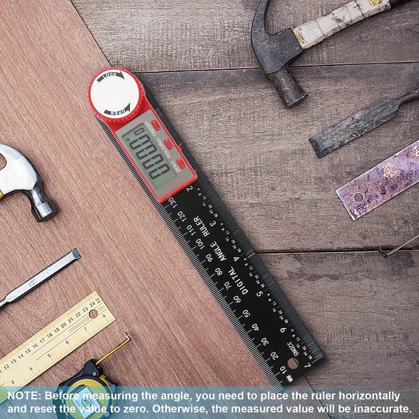 2-in-1 digital angle protractor and ruler for many uses, such as checking the angle of a table saw blade or the accuracy of a miter saw, making angle cuts or measurements, trimming or wall angle measurements