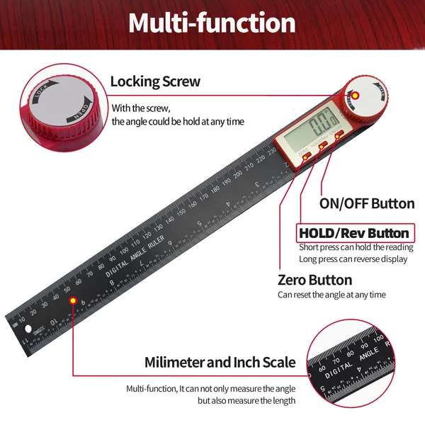Not only can you measure angles, but also lengths, with the ruler showing inches and millimeters. Length measurement range: 400mm/15.7 inches