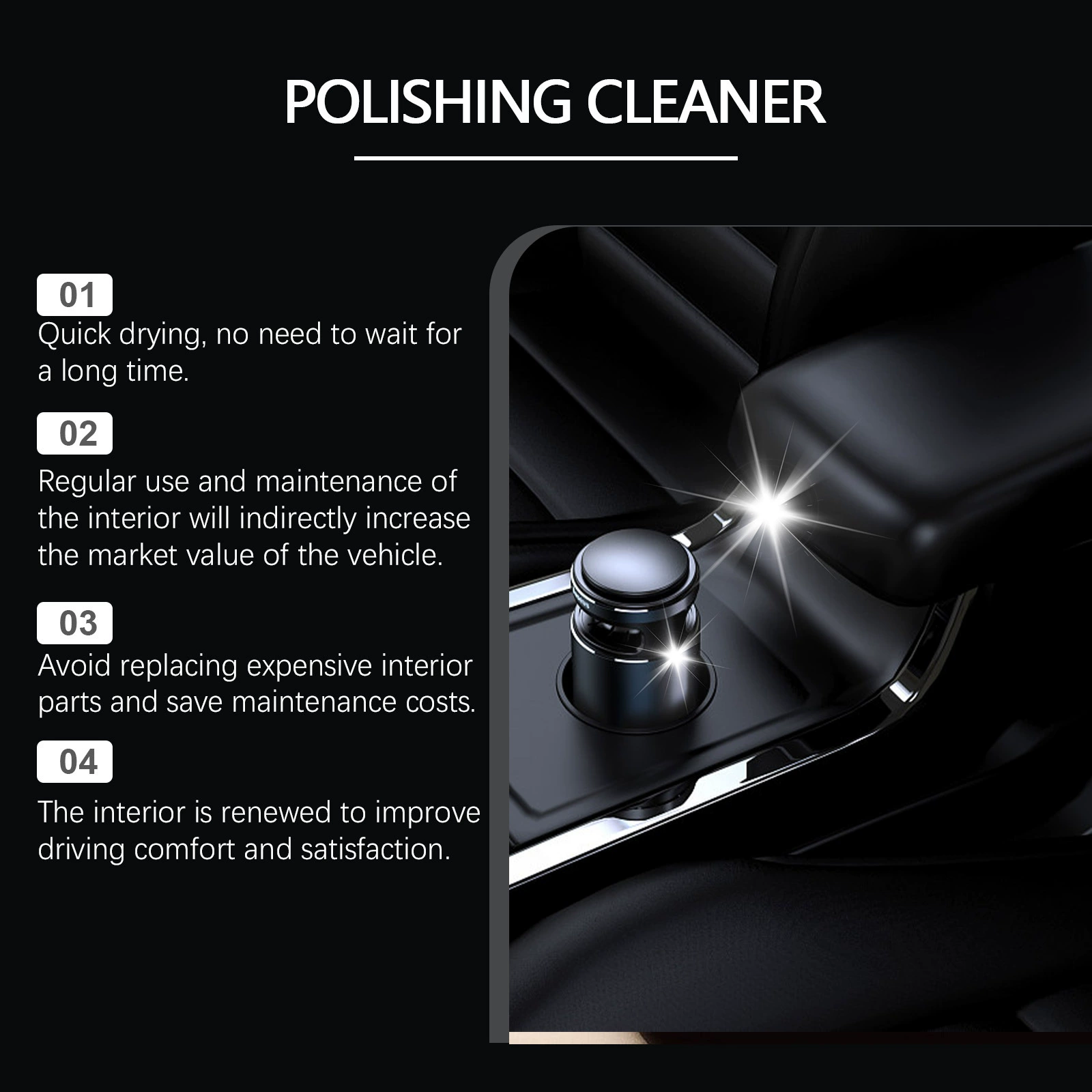 GREAT CLEANING POWER - Our Car Interior Polish contains innovative cleaning agents that effectively remove stubborn stains, grease, and dirt for a spotless result. This advanced formula penetrates even the smallest nooks and crannies for a deep clean. Experience lasting shine and protection with our revolutionary interior cleaner