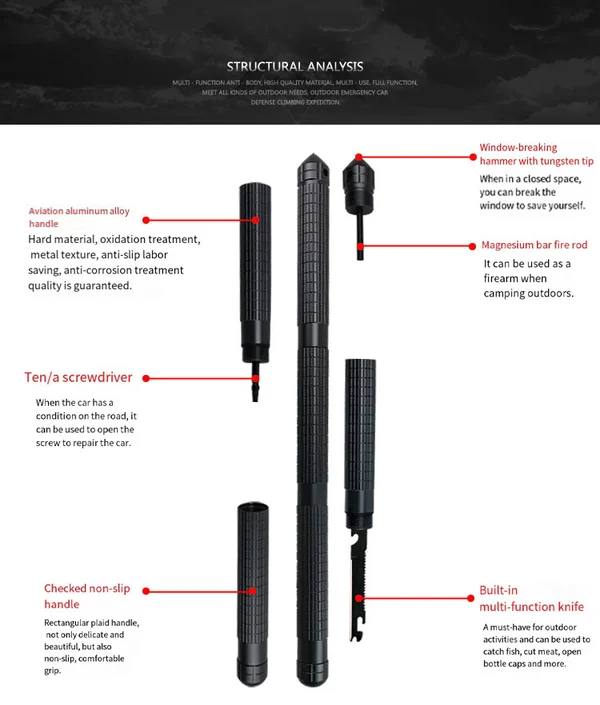is not some cheap piece of plastic this stick is heavy and sturdy to handle any situation. its works great with the tools safetly concealed inside ( multiple functions like a knife, compass, bottle opener, fish spear, screw driver, meet your different needs of outdoor activities.) extremely tough build quality and compact design.