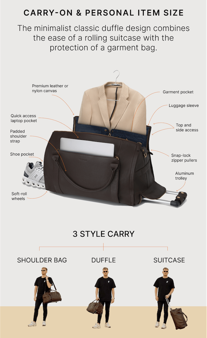 SUPER VERSATILE BAG: With the fancy design of combining the feature of garment bag and duffel bag, such as hanging clothes, various internal pockets (placed with tie, umbrella, wallet, mobile phone, etc.) and large capacity. On the side of the leather garment bag, there is a zip pocket for easy access to electronics or travel materials.